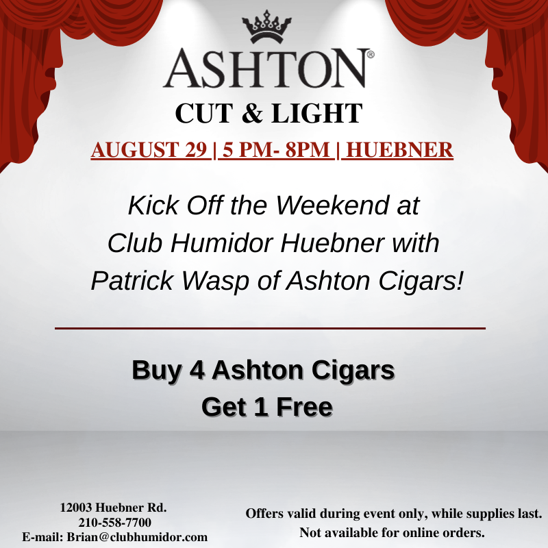 Join us at Club Humidor Huebner on August 29th from 5pm to 8pm for our Cut & Light with Ashton featuring Ashton’s Patrick Wasp!