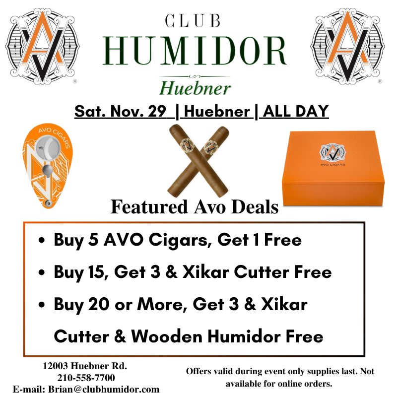 Join us at Club Humidor Huebner on Saturday, November 29th and enjoy fantastic deals on AVO Cigars!