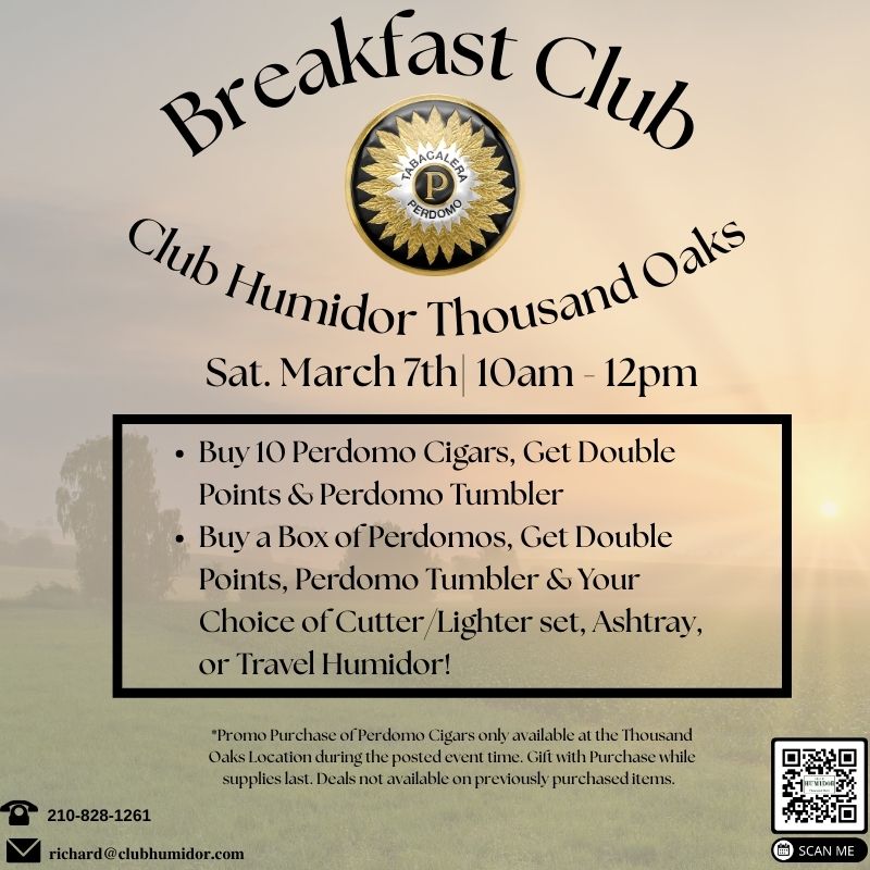 Welcome Back all you Early Bird Cigar Smokers! Club Humidor Thousand Oaks Welcomes back the Return of Breakfast Club! We are kicking things off Big for 2026! Join us March 7th from 10am to 12pm to Score yourself some Amazing Deals on Perdomo Cigars!
