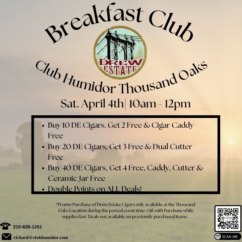 What a perfect way to start off your Saturday Morning then with a nice breakfast and an even better Cigar! Join us here at Club Humidor Thousand Oaks on April 4th from 10am to 12pm for some great deals on Drew Estate Cigars, which include lines such as Undercrown, Deadwood, Tabak, and many More!!!