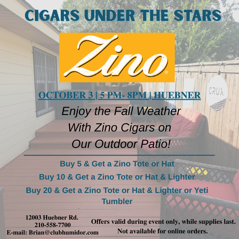 Join us at Club Humidor Huebner on October 3rd from 5pm to 8pm for Huebner’s first in our Cigars Under the Stars event series with Zino Cigars! Come and enjoy the fall weather with Zino cigars on our outdoor patio!