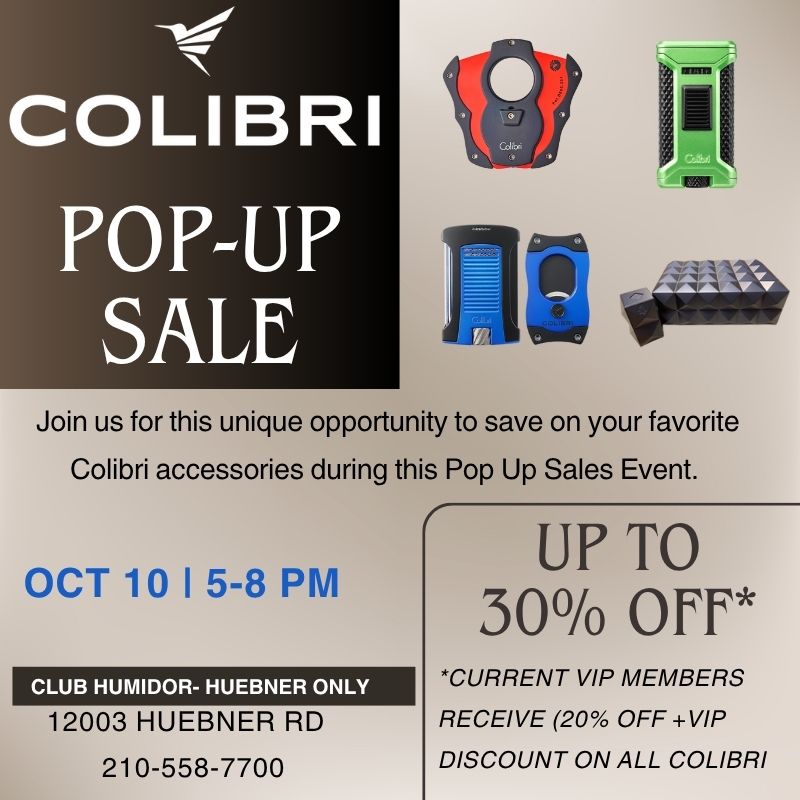 Join us at Club Humidor Huebner on October 10th from 5pm to 8pm for Huebner’s Colibri Pop Up Sale!