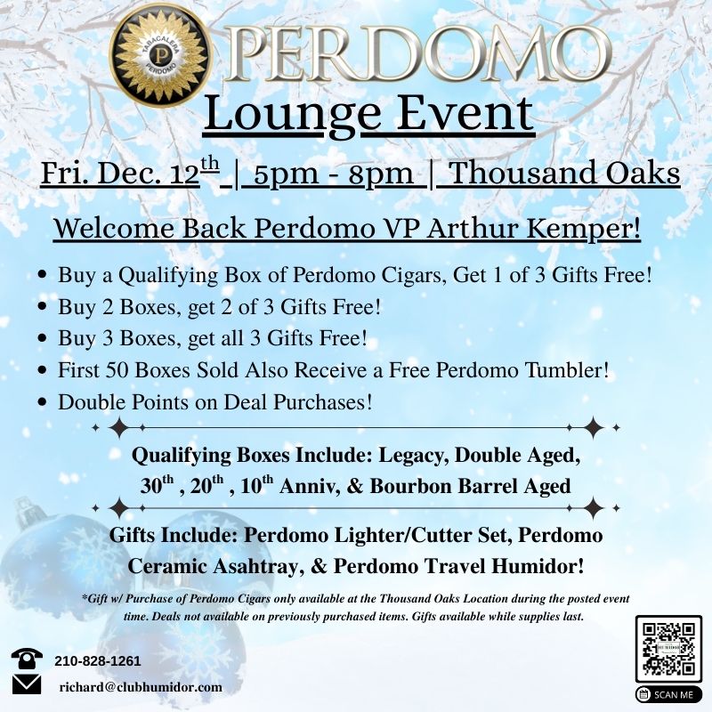Tis the Season for our Annual Perdomo Lounge Event! Friday December 12th from 5pm to 8pm at Club Humidor Thousand Oaks! Help us Welcome Back to the Perdomo Lounge, Perdomo Vice President and Club Humidor Alumni, Arthur Kemper! It will be an evening to remember!