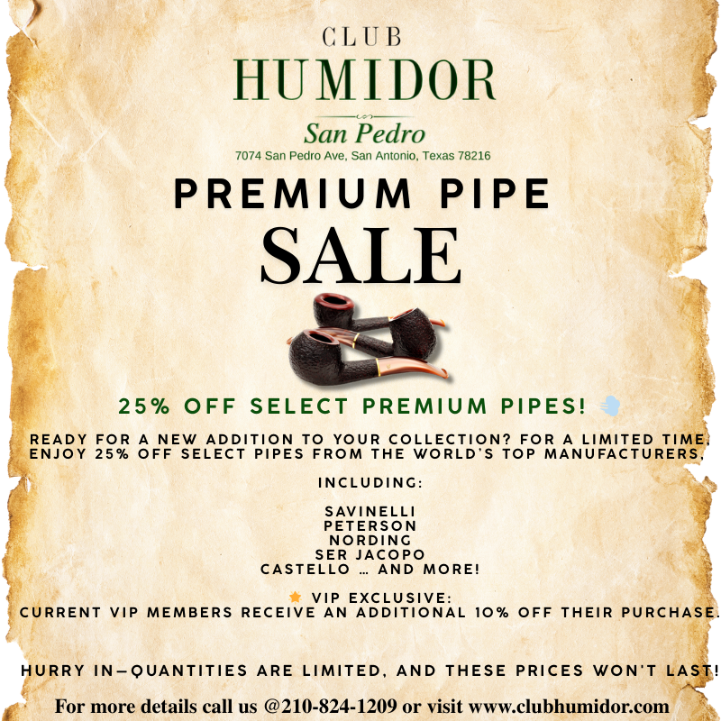 While supplies last at Club Humidor San Pedro, Enjoy 25% off of select pipes from premium brands like: