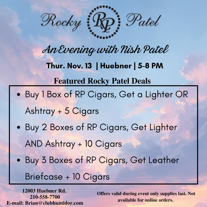Join us at Club Humidor Huebner on Thursday, November 13th from 5pm to 8pm for an evening with Nish Patel of Rocky Patel Cigars! Featured Rocky Patel deals include: