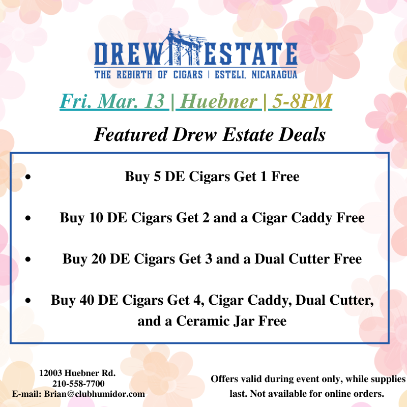 Join us at Club Humidor Huebner on March 13th from 5pm to 8pm and enjoy the vast selection of Drew Estate cigars with Sam Ventura!