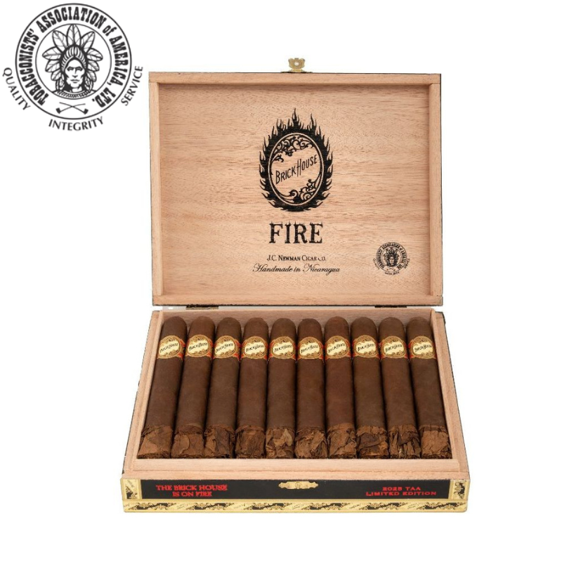 The 2025 TAA Exclusive from JC Newman The Brick House is on Fire is a 6” x 50 Toro with an unfinished foot that looks like a flame. “When you light The Brick House is on Fire, the cigar ignites in flames,” said fourth-generation owner Drew Newman.  “The Brick House is on Fire’s wrapper and binder are cut back to expose the filler leaves. We are excited to share this special cigar with TAA members.” The Brick House is on Fire features an Ecuador Havana wrapper with Nicaraguan binder and filler tobaccos aged for five years.
