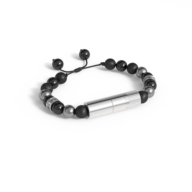 Introducing the Mercurio Ring I, the marriage of Hematite and Matte Black Onyx stone beads, adorned with two spacers to showcase your favorite brand.